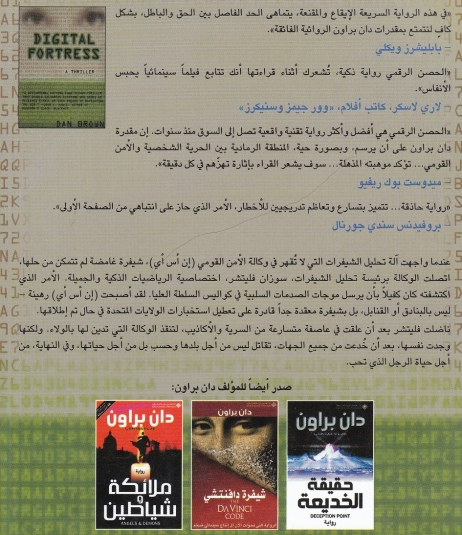 Dan Brown-Digitale Festung (Alhisn Arraqami) Dan Brown- Übersetzt durch Fayza Ghassan Al-Munjed + 1 Bild Sprache: AR 31,00 € In den Warenkorb 383 Seiten (24x17 cm), 580 gr, .Auflage 2005 Softcover 2 passende Produkte Dan Brown-Täuschung Punkt (Haqiqatu Alkhadiea) 14 Millionen Exemplare verkauft Sprache: AR 33,00 € In den Warenkorb Dan Brown-Engel und Teufel (Malaika wa Shayatin) 27 Millionen Exemplare verkauft Sprache: AR 37,00 € In den Warenkorb