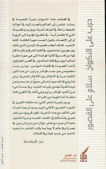 Krieg gegen die Hütten, Grüße an die Schlosser Volker Braun; Gedichte + 1 Bild Sprache: nur auf arabisch 10,00 € In den Warenkorb 103 A5 Seiten Gewicht : 150 g Verfasser: Volker Braun Übersetzt von: Mustafa Assulaiman Vorgestellt und vorbeireitet von: Mohamed Bnes Softcover